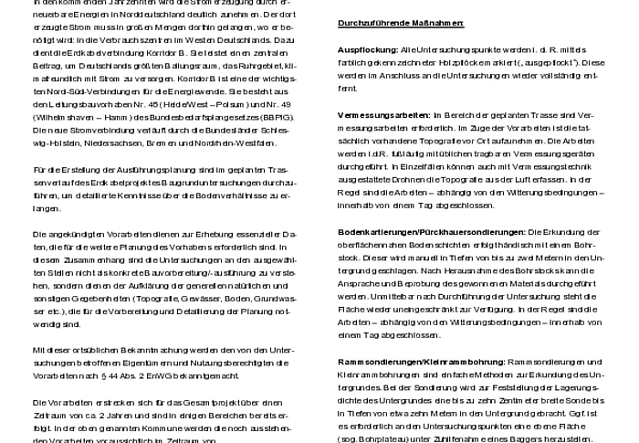 Bekanntmachung der TenneT TSO GmbH - Informationen zu Baugrundvoruntersuchungen (Bauvorbereitende Maßnahme gem. § 44 EnWG) 380-/110-kV-Leitung Hochwöhrden - Pöschendorf